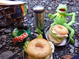 カーミットを道標にのせて写真を撮っていると、