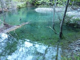 最初は沢の横を歩きます。何か所かせき止められていて、フィルターの役割を果たしているのか、水は澄んでいて、水底がきれいに見えます。
