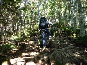 双児山経由で、下山。振り返ると甲斐駒ケ岳。標高2,643mの双児山山頂には12:30到着。木の中で何も周りは見えません。後は樹林帯を下るだけ。