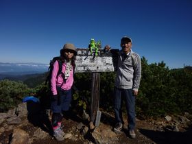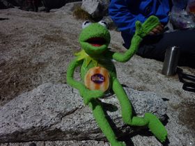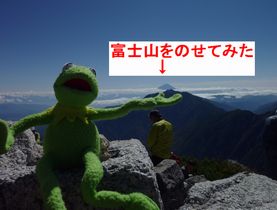 カーミットもご満悦。こうやって見ると富士山は小さいけれど、ここは長野と山梨の県境、普段他の百名山から眺める富士山より大きいんです。