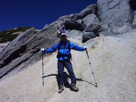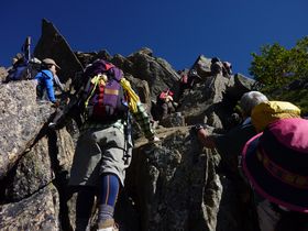 途中、岩尾根直登コースと巻き道があります。迷わず直登を選択。 ・・・すると、かなりの大渋滞。ちょっとストレスが溜まりましたが、山ですからね。事故があっては大変。お行儀よく待つことに。それにしても空が本当にきれい!