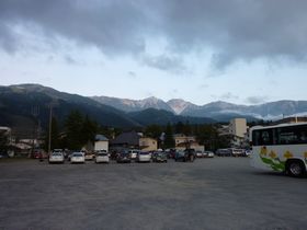 連休2日目、紅葉にはまだ早いせいか、駐車場は意外と空いていました。5:55猿倉行きのバス(片道900円)を待ちます。