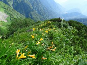 この写真はニッコウキスゲのお花畑だけれど登山道の両側から藪が伸び放題。暴れ草。