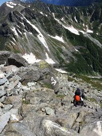 雪渓を登るツトちゃん、頑張れ〜!
