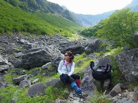 いつも苦しめられる横尾から上高地の平坦な道3時間。平坦は楽ですが、飽きるんです・・・そこで今回は、3人でしりとりしながら歩きました。人名しりとり→食べ物しりとりで、3時間退屈することなく11:30上高地に到着。私は横尾から傘を差したので被害は少なかったのですが、傘がないとかなりビショビショになったようです。 河童橋近くのアルペンホテルが12:00から日帰り入浴を受け付けていたのでありがたかった・・・