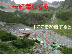 涸沢テント村!写真撮るときは、もっとたくさんあった方がカラフルできれいかも。 「2600〜2800m付近が紅葉している」と涸沢ヒュッテのHPに書いてありましたが、この辺りでしょう。 ちなみに来る途中、沢が枯れていて心配しましたが、涸沢はちゃんと水がありました。