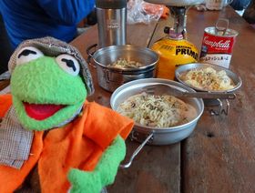 初日夜ごはんは、オイルサーディンのマスタード・マヨネーズチーズ焼き、タラいもサラダ、ミネストローネリゾットです。 オイルサーディンはなんと、缶ごとバーナーにのっけて焼くという大胆料理!!夜は寒くなって来たので、リゾットの温かみがありがたい♪