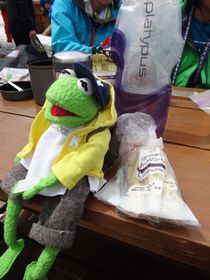 カーミットの新作衣装は、雪山は寒そうなのでパーカーと野球帽を作ってみた!Kのワッペン付き。