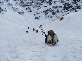 そしてこの山旅のメインイベント、そり滑り!上がってくる登山客の羨望の眼差しを受けながら、そりで滑ります。