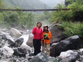 徳沢に到着。もりぞうさんはまだまだ体力があってノンストップで行こうとしましたが、さや吉の肩は悲鳴を上げていて、ザックを下ろすことに。そしたら私に声をかけてくる人が・・・なんと掲示板に書き込みをしてくれた、りゅうさんでした!! 書いてあった通り、お父様とご一緒でした。親子で山登り、とっても親孝行だと思います。このHPのお褒めの言葉を頂き、感動ものです!世の中にはたくさんのHPがあるのに、その中で私たちのHPを見て参考にしてくれている人がいると思うと、とってもうれしいです。まだまだたくさんお話をしたかったけれど、またいつかお会いできると信じております!