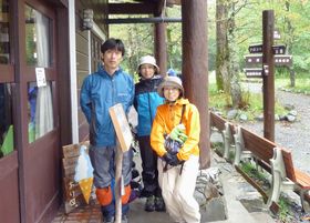 着いた途端、雨が本降りに・・・せっかくテント担いで来たけれど、ここまで雨が強いと不安が・・・ 平日だし、今夜は1人1つの布団も問題なさそうだし・・・とりあえずお茶しながら考えよう!お茶をしながら、同じテーブルについた人たちと話をしました。