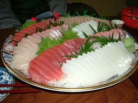これが高知名物の皿鉢(さわち)料理です。大きなお皿にお寿司を中心にいろんなものが盛られています。高知のお寿司はゆずが入った酢飯です。東京ではあまりお目にかかれません。お寿司もいろんな種類があって、筍の中に酢飯を詰めたもの、蒟蒻の中に酢飯をつめたもの・・・などなど。お刺身も豪快です。お刺身は口に運ぶ直前にしょうゆにつけるのではなく、食べる分を取り分けたら、その上からしょうゆをぶっかけて頂きます。