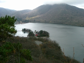 眼下に大沼が見えてきました。でもやはり、空はどんよりで寒いです。暑がりのたらんたんもTシャツ、スウェットの上にゴアテックスのジャケットを着ています。雲、なくならないかなぁ・・・