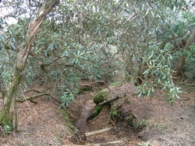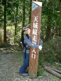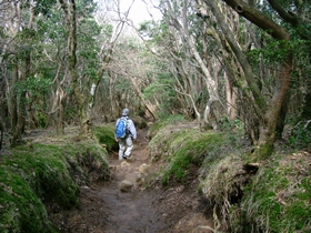 出発点の天城高原ゴルフ場から万二郎岳の裾を回るシャクナゲコースを予定していたが、途中シャクナゲ群生地保護のため、通行止め。同じ道を引き返すのって、おもしろくないけれど、仕方ない。万二郎岳を登る途中、至る所で通行止めの看板を見た。