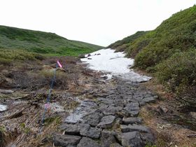 ここが「ガスるとベテランさんでも迷いますよ」と言われた賽の河原、雪渓の取り付き。ピンクのリボンがマークされています。前回の飯豊山で懲りたので、今回は12本アイゼン持参。この残雪だったら4本で充分だったかも?