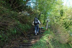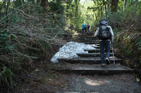 最初は阿弥陀堂に向かう石段を登っていきます。 「この石段はいつまで続くの?」と思ったら、いつの間にか木の階段になり、石で固めた階段になり・・・ しばらく林の中を歩きます。