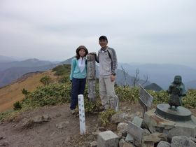 越後駒ケ岳、頂上に到着!ご覧の通り、見通しはあまりよくなく。。。さや吉の後ろに隠れていますが、越後三山の中ノ岳が見えます。