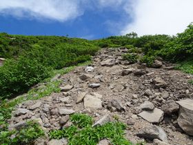 後からスタートして抜いて行ったワンコ連れの長靴姉さんが下りてきて「左側にハイマツの踏み後があるから、そこを歩くと楽だから・・・そこまで頑張って」と励まされ、何とか登り切る。