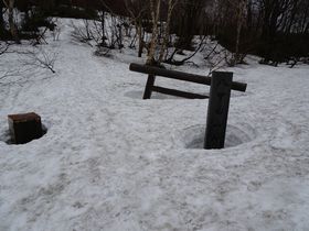 ピンクリボンももちろんなく、どこをあるいているのかわかりません。夏ではあり得ない湿原の上をどこでもいいから歩いている状態。ツトちゃんのGPS頼りに歩きます。GPSがなかったら、この時期歩くのが難しい湿原歩き。北海道では道が整備されていないのが普通なので、さすが北海道在住のツトちゃん。何のためらいもなくGPSを見ながらどんどん歩いていきます。。雪中行軍の悲しい事故のあったここ八甲田。自然の中ではなんの太刀打ちもできない人間の無力さを感じる山行でした。