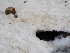 雪の下は勢いよく水が流れています