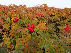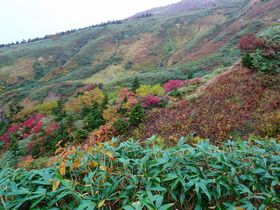 別当出合から黒ボコ岩までコースコースタイム220分のところ、130分で到着。バックの紅葉が綺麗です。 |