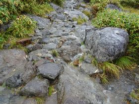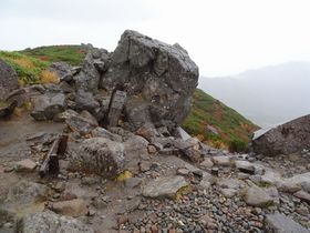 下山道を相談すると、観光新道は尾根道なので雨風をまともに受けるとのこと。同じ道だけど、砂防新道で下ることに。 |