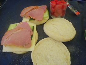 マフィンに昨日の残りのラーメン用チャーシューと、キュウリ・チーズを挟んで。奥にあるのは、アメーラルビンズという静岡産の高糖度トマト!高級品でこの量で398円なり。