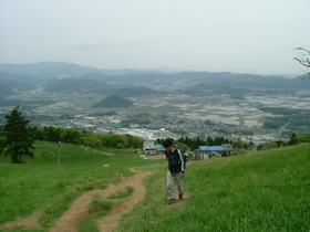 冬はスキーゲレンデになる草原の斜面を蛇行しながら登る。