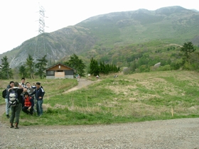 三合目に到着。前に見えるのが伊吹山。この斜面をジグザグに登っていく人の姿が続いています・・・