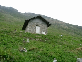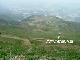 先ほどの写真から13分登ると、避難小屋はこの大きさになりました。確実に上に向かっていますよ〜