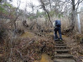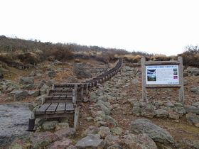 歩き出そうとしたところ、作業服を着た県職員?気象庁職員?らしく3人組が車から降りてきて、「今日から警戒レベルが1に下げられたんですよ」と登山口の張り紙を張り替えていました。