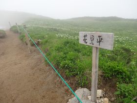 弓折岳手前の雪見平に6:15到着。雪田になっていて、お花も咲いていました。でもガスってよく見えない・・・