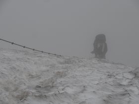 最初、先を歩いていたグループが「道がない、ない」と騒ぎだし、「も、もしや、このロープ・・・?」雪渓の入り口がわからず、朝で雪はツルツルに凍っていて、つま先が全く雪に入らず。アイゼンなんて持ってきてないし。。。でもどうやら雪渓の入り口を間違えていたらしく(ガスで見えなかった)階段状の足跡を見つけると、わりかし楽に登れました。でもこれって、上から下りてくる人がいたらどうするんだろう?!アイゼンつけていないので、道を譲れない・・・