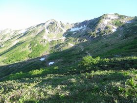 2014年07月27日 双六キャンプ場(5:30)〜雪見平(6:15)〜秩父平ロープ雪渓(8:30)〜笠ヶ岳山荘(10:40)
