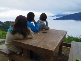 写真は夕飯後のまったりタイム。雲海を眺める3人のシンクロ写真!!明日天気にな〜れ。