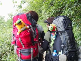 5:20に駐車場を出発して、5:40 柏原新道を出発。 この登山道はとっても歩きやすい。石畳になっていたり、階段が設置されていたり。。。柏原新道は山荘の現オーナーが昭和30年代後半から10年ぐらいかけて、ツルハシとスコップを使って独力で開いた道だそうです。そして今の山荘のスタッフがメンテを続けています。ありがたい!! 赤いザックのもりぞう夫妻。もりぞうのザックにはぐんまちゃん。