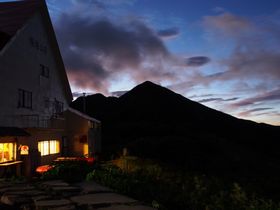 朝焼けがいい感じ!爺が岳の上から日の出見られるかな? 左の電気がついているところは給水所。まだ日の出前で暗いけれど登山者のために開いています。お水1リットル150円なり。