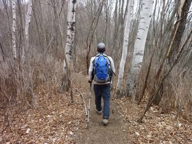 だいぶ踏み固められているのですが、たまにズボッとはまってしまった人の足跡があります。ストックを指して長さを確認してみると、70〜80センチはありそうです。ストックもつく地点を間違えると、ズボズボッと入っていき、ストックに頼り過ぎの重心移動は危険です。
