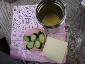 12:20、七ツ石小屋でお昼ご飯。 今日はきゅうり、チーズ、ハムをサンドしたマフィンと コーンスープ。