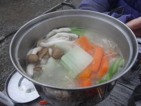 標高1150m、鴨沢のバス停まであと1時間のところで朝食。 朝ごはんはあゆみちゃん担当で、サムゲタンスープにお餅を入れて食べました。コショウの辛さが程良く、体が温まる〜 バスの時間が気になったけれど、コーヒーも飲みました。