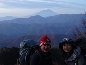山頂の避難小屋を過ぎ、小雲取山?付近でチョビっと雪を被った富士山をバックに撮ってもらいました。 同じテン場に昨日いた方たちで、「今年の夏は週末全部雨で、残念でしたね〜」なんて世間話をしました。