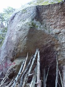 桃太郎岩です。たくさんの棒が、岩を支えています。(ウソ)お茶目な登山客が、どんどん木の枝をたてかけて、まるで棒が岩を支えているように置いていきます。