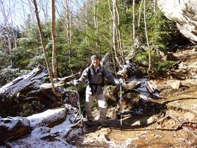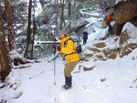 もりぞうさん、スキー中。後ろの岩でロープがぶらさがっている所は凍ってツルツルでした。スリリングで楽しかった〜