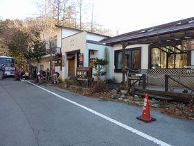 駐車場に到着。3連休最終日、シーズンも終わりということで、朝7時の時点で100台ぐらい停められる駐車場は4分の1しか埋まっていませんでした。この建物は瑞牆山荘で、カフェになっています。おっしゃれ〜