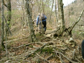 最初は木の根が登山道を這っている歩きにくい急な道。ときどき両手を使って登って行きます。季節にはお花がたくさん咲くらしいが、時期尚早・・・