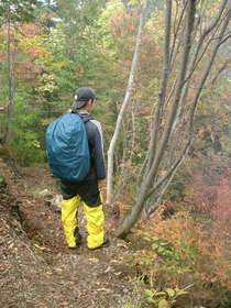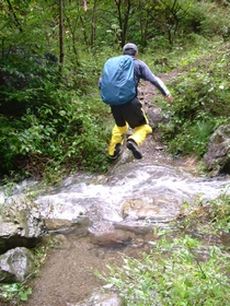 12:30 小屋を超えるとこんな山道が・・・黄色のレインウェアはよく目立ちます。この山道、結構長かった・・・