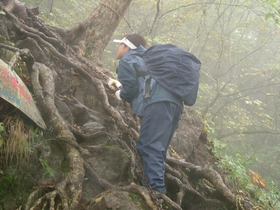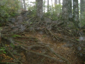 木の根がなんだか動き出しそう・・・このお山はストック禁止だそうです。普段ストックを使用して登山していますが、ストック禁止と聞いて今回はストックなしで登りました。出会う多くの人がストックを使用していて、「持ってくれば楽だったかな・・」と思いましたが、この木の根を見て「ストックでこの根を傷つけてはいけない」と切に感じました。