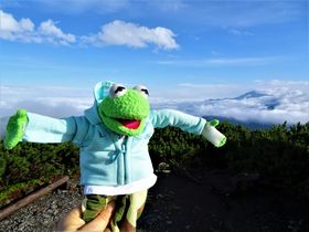 カーミットを肩に乗せて撮ったバックショットの向こうに、塩見岳が!