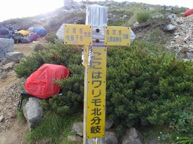 祖父岳(じいだけ)山頂を経由して、7:25ワリモ北分岐に到着。 ちなみに祖父岳の他に祖母岳(ばあだけ)という山も雲の平手前にありました。 ワリモ北分岐の手前に水場標識があったのですが、そこから3分となっていて、雲の平で汲んでおいて良かった・・・