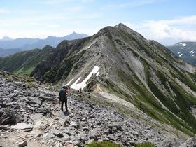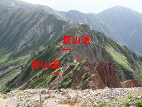 この赤茶けた岩山に、登山道があります!この道はかなりスリリング!野口五郎岳に向かう尾根道です。歩いている人はいませんでしたが、見ているだけでゾクゾクします。